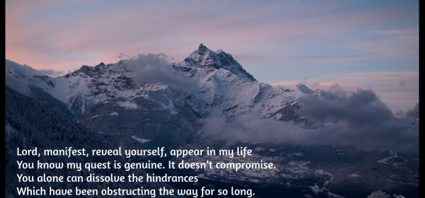 Lord, manifest, reveal yourself, appear in my lifeYou know my quest is genuine. It doesn’t compromise.You alone can dissolve the hindrancesWhich have been obstructing the