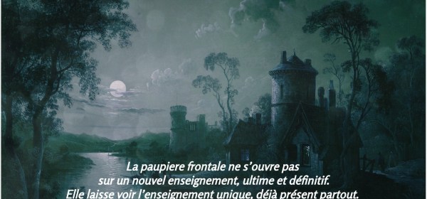 « La paupière frontaleNe s’ouvre pas sur un nouvel enseignement, ultime et définitif.Elle laisse voir l’enseignement unique, déjà présent partout. Il est nécessaire que le rideau